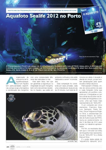 minutos por atleta. A duração é aferida ao minuto, já que existem penalizações para quem excede o tempo de prova. Participaram 9 Atletas, vindos de vários pontos do país e cada fotógrafo tinha que apresentar um portfólio composto por 3 fotografias e o júri teve ainda de escolher de entre todas as fotografias a concurso, uma que fosse mais representativa do “SEALIFE”. O júri composto por cinco elementos: Francisco Dias, Luís Sarmento, Pedro Gomes, Óscar Felgueira e Rogério Silva, e assessorado por Armando Ribeiro da Comissão de Audiovisuais da FPAS, reuniu-se posteriormente no dia 12 de Maio de 2012, para avaliar os trabalhos apresentados. Por fim, os resultados ditaram que o vencedor do troféu da fotografia mais representativa do “SEALIFE” foi o Atleta Manuel Silva. E o pódio desta edição do “AQUAFOTO SEALIFE 2012”