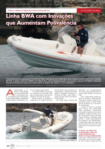 fabricados em Neoprene/Hypalon Orca do principal fabricante do mundo deste material, a Pennel & Flipo. Hoje, a BWA fabrica quatro gamas de modelos, Extra-Ordinari, Profissional, Tender e Diporto, embarcações desde os 4,50 metros até um cabinado com 12,60 metros de comprimento. A linha HP Reef foi concebida para oferecer uma embarcação muito polivalente, desenvolvida com grande ergonomia, de modo a satisfazer o máximo conforto. Nestas embarcações foram aplicadas muitas soluções inovadoras, para permitir o melhor aproveitamento dos espaços e dos equipamentos. A gama BWA para 2012 apresenta sete modelos HP Reef dos 5,38 metros aos 8,15 metros de comprimento. O BWA HP Reef 60 incorpora amplas características para as suas dimensões Vimos que o BWA Reef 60 é um semi-rígido com uma linha elegante, tem os tubos colados por fora