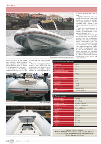 tra sempre direito e sem travar na água. O piloto vai também numa boa posição de condução, muito bem apoiado no encosto, ou sentado com os pés apoiados e faz uma condução suave, segura e sem esforço, especialmente nas manobras. Outro bom comportamento do Reef 60 é que o casco deflecte muito bem a água sem molhar o poço, que no final estava seco. Devemos destacar, no final, que este modelo BWA HP Reef 60 é um semi-rígido que, para as suas dimensões, foi desenvolvido para permitir uma utilização muito polivalente e está muito bem fornecido em equipamento, para conseguir esses objetivos e satisfazer bastante o cliente e os utilizadores. O tipo de casco é outra mais-valia deste modelo, pois pode com toda a segurança navegar ao longo da costa ou ir até aos pesqueiros, com toda a segurança, mesmo com o mar pouco favorável.