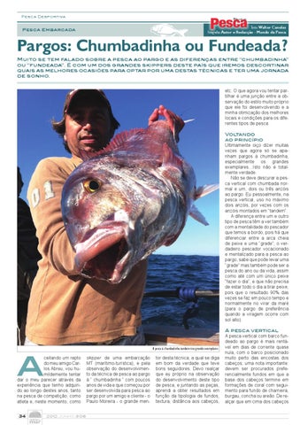 Pargos: Chumbadinha ou Fundeada? Muito se tem falado sobre a pesca ao pargo e as diferenças entre “chumbadinha” ou “fundeada”. É com um dos grandes skippers deste país que iremos descortinar quais as melhores ocasiões para optar por uma destas técnicas e ter uma jornada de sonho. etc. O que agora vou tentar partilhar é uma junção entre a observação do estilo muito próprio que ele foi desenvolvendo e a minha otimização dos melhores locais e condições para os diferentes tipos de pesca. Voltando ao princípio Ultimamente oiço dizer muitas vezes que agora só se apanham pargos à chumbadinha, especialmente os grandes exemplares…Isto não é totalmente verdade. Não se deve descurar a pesca vertical com chumbada normal e um, dois ou três anzóis ao pargo. Eu pessoalmente, na pesca vertical, uso no máximo dois anzóis, por vezes com os anzóis montados em “tandem”. A diferença entre um e outro tipo de pesca têm a ver também com a mentalidade do pescador que temos a bordo, pois há que diferenciar entre a arca cheia de peixe e uma “grade”; o verdadeiro pescador vocacionado e mentalizado para a pesca ao pargo, sabe que pode levar uma “grade” mas também pode ser a pesca do ano ou da vida, assim como até com um único peixe “fazer o dia”, e que não precisa de estar todo o dia a tirar peixe, pois que o resultado 90% das vezes se faz em pouco tempo e normalmente no virar da maré (para o pargo de preferência quando a viragem ocorre com sol alto).