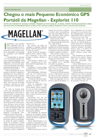viagem com um clique e mantém o controle sobre as estatísticas úteis, tais como distância percorrida, velocidade média, ganhos de elevação e descida, etc. Preço com IVA: 159€. Distribuidor Oficial para Portugal: Nautel-Sistemas Eletrónicos Lda – www.nautel.pt Facebook : magellanGPSportugalMenus Fáceis de Navegar e Gráicos Ricos: gráicos vibrantes e modernos, seu menu principal é simples, interativo e intuitivo. Tela colorida e legível à luz solar: tela colorida translectiva de 2.2” permite uma ótima legibilidade à luz solar direta. Resistente e a prova d’água aos padrões IPX-7: diversão sem danos ao aparelho. Alta sensibilidade SiRFstarIII GPS com 3 a 5 metros de precisão: fornece uma experiência superior de navegação. 18 Horas de vida útil da bateria com 2 baterias AA: Dura um dia inteiro (ou mais). Não precisa parar para trocar as baterias. Modo de suspensão: ao conservar a vida útil da bateria, co-