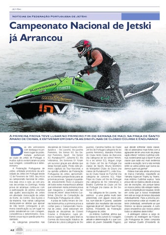 os oito vencedores com destaque no primeiro lugar do pódio, metade pertencem ao clube de Jetski de Portugal, e muitos outros evidenciaram-se pela sua coragem, consistência e determinismo A Federação Portuguesa de Jetski, entidade promotora da actividade de Jetski em Portugal desde 12 de Fevereiro de 1993, deu início ao campeonato nacional de Jetski, nos dias cinco e seis, já com provas decorridas no Domingo. Nesta prova de arranque contou-se com a participação de pilotos oriundos das quatro associações de Jetski em atividade: Associação de Jetski do Norte, do Centro, dos Açores e da Madeira. Nas várias categorias destacaram-se atletas que apesar de não terem conseguido a primeira classificação ou um lugar no pódio debateram-se com coragem, consistência e determinismo, mostrando a sua raça e paixão pela modalidade. As categorias presentes nas 42