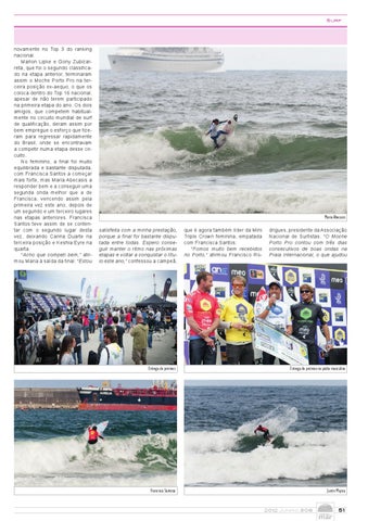 novamente no Top 3 do ranking nacional. Marlon Lipke e Gony Zubizarreta, que foi o segundo classificado na etapa anterior, terminaram assim o Moche Porto Pro na terceira posição ex-aequo, o que os coloca dentro do Top 16 nacional, apesar de não terem participado na primeira etapa do ano. Os dois amigos, que competem habitualmente no circuito mundial de surf de qualificação, deram assim por bem empregue o esforço que fizeram para regressar rapidamente do Brasil, onde se encontravam a competir numa etapa desse circuito. No feminino, a final foi muito equilibrada e bastante disputada, com Francisca Santos a começar mais forte, mas Maria Abecasis a responder bem e a conseguir uma segunda onda melhor que a de Francisca, vencendo assim pela primeira vez este ano, depois de um segundo e um terceiro lugares nas etapas anteriores. Francisca Santos teve assim de se contentar com o segundo lugar desta vez, deixando Carina Duarte na terceira posição e Keshia Eyre na quarta. “Acho que competi bem,” afirmou Maria à saída da final. “Estou