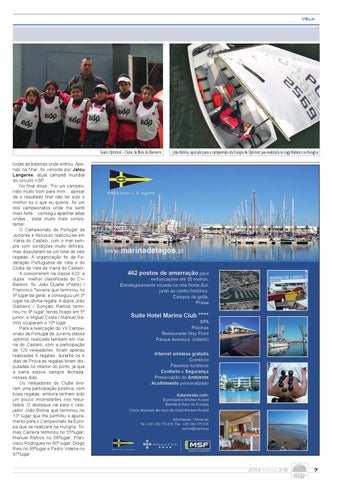 todas as baterias onde entrou. Apenas na final, foi vencida por Jalou Langeree, atual campeã mundial do circuito KSP. No final disse: “Foi um campeonato muito bom para mim... apesar de o resultado final não ter sido o melhor ou o que eu queria...foi um dos campeonatos onde me senti mais forte... consegui apanhar altas ondas... estar muito mais consistente! O Campeonato de Portugal de Juniores e Absoluto realizou-se em Viana do Castelo, com o mar sempre com condições muito diifíceis, mas disputaram-se um total de seis regatas. A organização foi da Federação Portuguesa de Vela e do Clube de Vela de Viana do Castelo. A concorrerem na classe 420, a dupla melhor classificada do CVBareiro, foi João Duarte (Peste) / Francisco Teixeira que terminou no 8º lugar da geral, e conseguiu um 3º lugar na última regata. A dupla João Gameiro / Gonçalo Ramos terminou no 9º lugar, tendo ficado em 5º junior, e Miguel Costa / Manuel Gamito ocuparam o 10º lugar. Para a realização do VII Campeonato de Portugal de Juvenis classe optimist, realizado também em Viana do Castelo, com a participação de 120 velejadores, foram apenas realizadas 6 regatas, durante os 4 dias de Prova.as regatas foram disputadas no interior do porto, já que a barra esteve sempre fechada, nesses dias. Os velejadores do Clube tiveram uma participação positiva, com boas regatas, embora tenham sido um pouco inconstantes nos resultados. O destaque vai para o velejador João Bolina que terminou no 13º lugar que lhe permitiu o apuramento para o Campeonato da Europa que se realizará na Hungria; Tomás Carreira terminou no 55ºlugar; Manuel Ramos no 58ºlugar; Francisco Rodrigues no 80º lugar; Diogo Reis no 88ºlugar e Pedro Videira no 97ºlugar. 2013 Abril 316