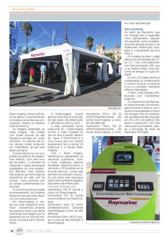 Raymarine No stand da Raymarine, que em Portugal tem a Nautiradar como representante, estavam em exposição, como novidades, a terceira geração da Serie c de Widescreen Multifunções Diysplays e o lançamento da nova Serie a. Os modelos da série c estão disponíveis em formatos de 9.0” ou 12.1” com LCD widescreen com retro-iluminação LED, que é ao mesmo tempo uma economia de energia e é super brilhante O ecrã LCD ligado elimina a condensação ou contaminação no interior do ecrã, e maximiza a cor e o contraste, impedindo reflexos indesejados. A Série a são Displays Multifunções com “chartplotting” poderoso. Os engenheiros da Raymarine desenvolveram com tecnologias exclusivas a Serie a, com o objectivo de possibilitar um amador navegar como um profissional, auxiliado pela alta resolução em 2D ou 3D, com gráficos, foto aérea e peixes-alvo com uma clareza sem precedentes, usando a tecnologia de sonar da Raymarine HD Digital.