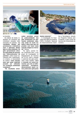 çados permitem prever as potencialidades dos géis sintetizados em aplicações ambientais reais, mas ainda há muito trabalho a fazer para que um produto com base nesta solução chegue ao mercado”, reforça. Por agora, conclui Cesar Cavalcante Filho, o seu grupo de investigação no Departamento de Química da FCTUC está a estudar o potencial dos géis produzidos neste trabalho ”para a remoção de outros poluentes, que não os hidrocarbonetos aromáticos, demonstrando assim outras potenciais aplicações