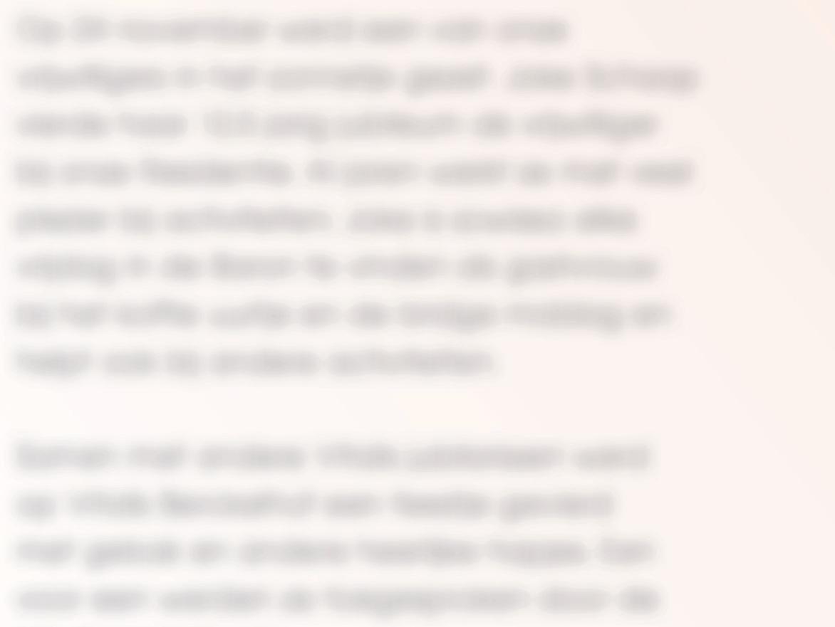 Dag allemaal, Wat kijk ik terug op een mooi afscheid! Het liefste was ik de laatste dag dat ik op Petruspark aan het werk was, meteen na het werk de voordeur uitgelopen, niet graag in de belangstelling staand. Maar wat ben ik blij dat ik dat niet gedaan heb! Met een glimlach kijk ik terug op die ochtend 18 november waar ik de laatste keer in de Baron met jullie allemaal samen mocht zijn.