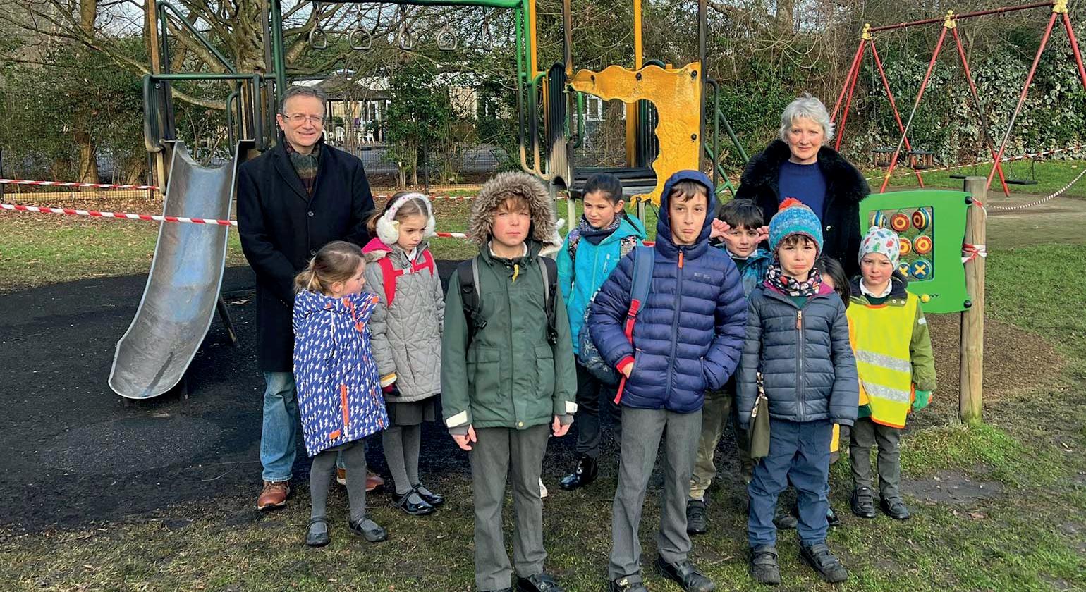 Ed Knolleys and Cllr Alison Born with children by the damaged play equipment