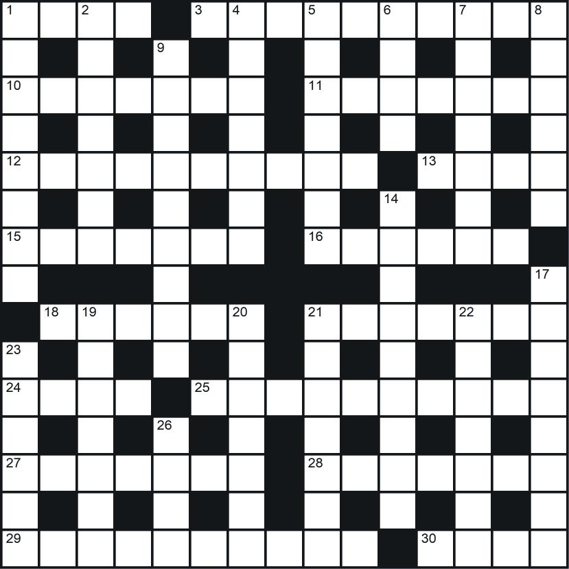 Across: 1 Traps, 4 Newspaper, 10 Shop, 11 Negatively, 12 Nail file, 13 Length, 14 Astronomer, 17 Eros, 19 Elsa, 21 Benefitted, 24 Adapts, 26 Balinese, 27 Debasement, 28 Ne'er, 29 Footsteps, 30 Aside.