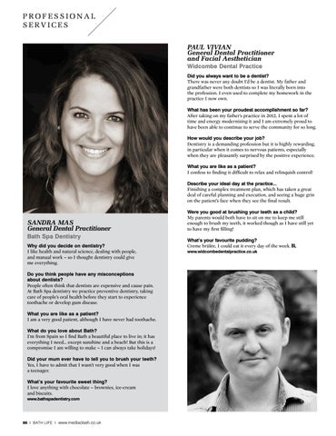 PROFESSIONAL SERVICES PAUL VIVIAN General Dental Practitioner and Facial Aesthetician Widcombe Dental Practice Did you always want to be a dentist? There was never any doubt I’d be a dentist. My father and grandfather were both dentists so I was literally born into the profession. I even used to complete my homework in the practice I now own. What has been your proudest accomplishment so far? After taking on my father’s practice in 2012, I spent a lot of time and energy modernising it and I am extremely proud to have been able to continue to serve the community for so long. How would you describe your job? Dentistry is a demanding profession but it is highly rewarding, in particular when it comes to nervous patients, especially when they are pleasantly surprised by the positive experience. What you are like as a patient? I confess to finding it difficult to relax and relinquish control! Describe your ideal day at the practice... Finishing a complex treatment plan, which has taken a great deal of careful planning and execution, and seeing a huge grin on the patient’s face when they see the final result.
