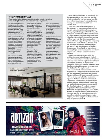 THE PROFESSIONALS These are the hair and beauty appointments the experts themselves will be treating themselves to in preparation for party season… “I’m really looking forward to having lustrous chrome gel nails. I need to keep my nails short for work, so I rarely bother to paint them. This is my chance to treat myself.” Beatrice Pounder, The Duchess, Walcot Street, Bath “Skin repairs faster at night, so we’ve devised the Dusk to Dawn Night Repair Oil to lend a helping hand. The blend of nine pure oils promotes relaxation – perfect to help me switch off and ensure glowing and hydrated skin the next day.” Emma Webber, Natural Spa Factory, Foxcote Avenue, Bath “I’m booking in for a CACI Bum Lift to get the Pippa Middleton effect in that little black dress. The electro cellulite massager treatment gives instant lifting and