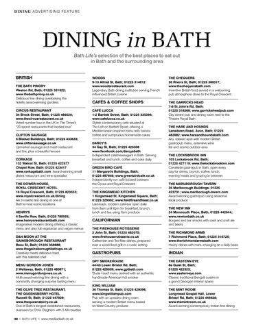 DINING in BATH Bath Life’s selection of the best places to eat out in Bath and the surrounding area BRITISH THE BATH PRIORY Weston Rd, Bath; 01225 331922; www.thebathpriory.co.uk Delicious fine dining overlooking the hotel's award-winning gardens CIRCUS RESTAURANT 34 Brock Street, Bath; 01225 466020; www.thecircusrestaurant.co.uk Voted number four in the UK in The Times's “20 secret restaurants that foodies love” CLIFTON SAUSAGE 5 Bladud Buildings, Bath; 01225 433633; www.cliftonsausage.co.uk Upmarket sausage and mash restaurant and bar, plus a beautiful terrace CORKAGE 132 Walcot St, Bath; 01225 422577 Chapel Row, Bath; 01225 423417 www.corkagebath.com Award-winning small plates restaurant and wine specialist THE DOWER HOUSE, ROYAL CRESCENT HOTEL 16 Royal Crescent, Bath; 01225 823333; www.royalcrescent.co.uk/dining AA 3 rosette fine dining at one of Bath’s most iconic locations HENRY'S 4 Saville Row, Bath; 01225 780055; www.henrysrestaurantbath.com Imaginative modern dining offering a classic menu and also full vegetarian and vegan menus DAN MOON AT THE GAINSBOROUGH RESTAURANT Beau St, Bath; 01225 358888; www.thegainsboroughbathspa.co.uk Creativity meets delicious food with this talented chef MENU GORDON JONES 2 Wellsway, Bath; 01225 480871; www.menugordonjones.co.uk Multi award-winning fine dining with a constantly changing surprise tasting menu THE OLIVE TREE RESTAURANT, THE QUEENSBERRY HOTEL Russell St, Bath; 01225 447928; www.thequeensberry.co.uk One of Bath’s longest established restaurants, overseen by Chris Cleghorn with 3 AA rosettes 66 I BATH LIFE I www.mediaclash.co.uk