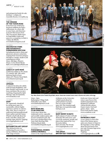 of physics at the University of Bath speak about her achievements in science. Part of a series of talks. 6pm; £15; The Gainsborough Bath Spa; www.gainsborough bathspa.co.uk 26 AP R IL