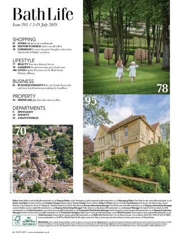 Editor Matt Bielby matt.bielby@mediaclash.co.uk Deputy Editor Lydia Tewkesbury lydia.tewkesbury@mediaclash.co.uk Managing Editor Deri Robins deri.robins@mediaclash.co.uk Senior Art Editor Andrew Richmond Graphic Design Megan Allison Cover Design Trevor Gilham Editor’s Photo Damon Charles Contributors Ané Auret, Nic Bottomley, David Flatman, Paul Marland, Anna O’Callaghan, Matilda Walton and Nick Woodhouse Group Advertising Manager Pat White pat.white@mediaclash.co.uk Deputy Advertising Manager Justine Walker justine.walker@mediaclash.co.uk Deputy Advertising Manager Polly Jackson polly.jackson@mediaclash.co.uk Account Manager Annabel North annabel.north@ mediaclash.co.uk Sales Executive Louis Grey louis.grey@mediaclash.co.uk Production/Distribution Manager Sarah Kingston sarah.kingston@mediaclash.co.uk Deputy Production Manager Kirstie Howe kirstie.howe@mediaclash.co.uk Production Designer Matt Gynn matt.gynn@mediaclash.co.uk Chief Executive Jane Ingham jane.ingham@mediaclash.co.uk Chief Executive Greg Ingham greg.ingham@mediaclash.co.uk Bath Life MediaClash, Circus Mews House, Circus Mews, Bath BA1 2PW 01225 475800 www.mediaclash.co.uk @The MediaClash © All rights reserved. May not be reproduced without written permission of MediaClash. We’re a Bath-based publisher, creative agency and event organiser Magazines Our portfolio of regional magazines celebrates the best of local living: Bath, Bristol, Cardiff, Exeter and Salisbury. We also publish foodie mag Crumbs (www.crumbsmag.com, @CrumbsMag). Agency From the design and build of websites to digital marketing and creating company magazines, we can help. Events We create, market, promote and operate a wide variety of events both for MediaClash and our clients Contact: info@mediaclash.co.uk