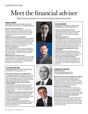 MANAGING DIRECTOR, ONE 77 MORTGAGES 01225 667177; www.one77fs.co.uk Why would somebody need a mortgage adviser? A mortgage adviser/broker can search the market for you and find the best deals. You’d be daft if you just go to your bank for a mortgage, as you won’t know if the bank next door is doing a better deal. We can compare and contrast deals and give expert advice on the best option. What is the biggest misconception surrounding financial advice? Lots of people think all brokers charge fees, but every adviser/broker in the UK gets paid by the bank the business is placed with and as a result, we don’t charge client fees on top i.e – our service is completely free of charge to clients. In what ways do you think your work benefits people? We allow them to compare all the lenders via a simple phone call or via our website. Not shopping around lenders can result in clients paying thousands of pounds more over a couple of years for their mortgage! What do you specialize in? All areas of property finance, be that residential purchase and remortgages, bridging deals, commercial finance and development finance. Basically, anything relating to property finance.