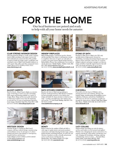 Inspired design and styling can excite & enhance our lives and enable us to feel nurtured and uplifted. Whether it be redesigning the interior and exterior of a property, altering the colour palette, introducing a new style, changing soft furnishings, refreshing, replacing or decluttering – leave it to Lucy… The Coach House, Linden Gardens, Weston Road, Bath BA1 8DB; Tel: 07710 223285; www.lucycollins.me www.mediaclash.co.uk I BATH LIFE I 105