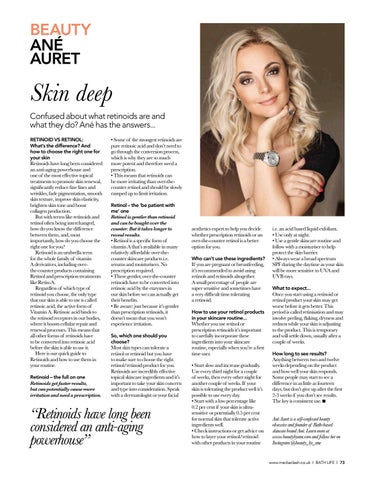 Retinoids have long been considered an anti-aging powerhouse and one of the most effecti e topical treatments to promote skin renewal, significantly reduce fine lines and wrinkles, fade pigmentation, smooth skin texture, improve skin elasticity, brighten skin tone and boost collagen production. But with terms like retinoids and retinol often being interchanged, how do you know the difference between them, and, most importantly, how do you choose the right one for you? Retinoid is an umbrella term for the whole family of vitamin A derivatives, including overthe-counter products containing Retinol and prescription treatments like Retin-A. Regardless of which type of retinoid you choose, the only type that our skin is able to use is called retinoic acid, the active form of Vitamin A. Retinoic acid binds to the retinoid receptors in our bodies, where it boosts cellular repair and renewal processes. This means that all other forms of retinoids have to be converted into retinoic acid before the skin is able to use it. Here is our quick guide to Retinoids and how to use them in your routine. Retinoid – the full on one Retinoids get faster results, but can potentially cause more irritation and need a prescription.