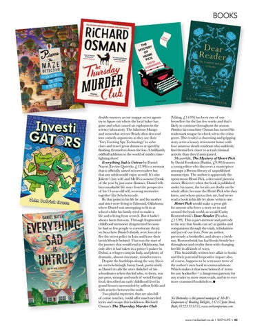 double-mystery as our snappy secret agents try to figure out where the local baker has gone and what caused an explosion in the science laboratory. The hilarious Mango and somewhat stricter Brash often descend into comedy arguments as they use their ‘Very Exciting Spy Technology’ to solve clues and travel great distances at speed by flushing themselves down the loo. A brilliantly oddball addition to the world of misfit crimefighting duos! Everything Sad is Untrue by Daniel Nayeri (Levine Querido, £12.99) is a memoir that is officially aimed at teen readers but that any adult would enjoy as well. It’s also Juliette’s (my wife and Mr B’s co-owner) book of the year by just some distance. Daniel tells his remarkable life story from the perspective of his 13-year-old self, weaving memories together like Scheherazade. By that point in his life he and his mother and sister were living in Edmond, Oklahoma where Daniel was attempting to fit in at school whilst his family tried to make a life and a living from scratch. But it hadn’t always been that way. Through fragmented childhood memories (fragmented because he had so few people to corroborate them) we hear how Daniel’s family were forced to flee the secret police in Iran and leave their lavish lifestyle behind. That was the start of the journey that would end in Oklahoma, but only after it had taken in a prince’s palace in Dubai, a refugee camp in Italy, and plenty of dramatic, almost cinematic, misadventures. Despite the hardships along the way, this is an overwhelmingly funny book, particularly as Daniel recalls the utter disbelief of his schoolmates when this kid who, to them, was just poor, strange and smelt of weird foreign food, described an early childhood lived in grand houses surrounded by saffron fields and with aviaries between the walls. Two playful mysteries, that are also full of comic touches, could offer much needed levity and escape this lockdown. Richard Osman’s The Thursday Murder Club