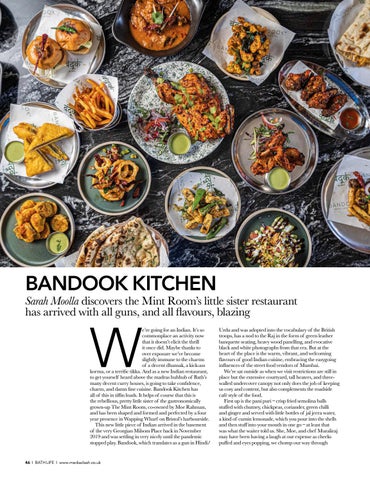 Urdu and was adopted into the vocabulary of the British troops, has a nod to the Raj in the form of green leather banquette seating, heavy wood panelling, and evocative black and white photographs from that era. But at the heart of the place is the warm, vibrant, and welcoming flavours of good Indian cuisine, embracing the easygoing influences of the street food vendors of Mumbai. We’re sat outside as when we visit restrictions are still in place but the extensive courtyard, tall heaters, and threewalled undercover canopy not only does the job of keeping us cosy and content, but also complements the roadside café style of the food. First up is the pani puri – crisp fried semolina balls stuffed with chutney, chickpeas, coriander, green chilli and ginger and served with little bottles of jal jeera water, a kind of cumin lemonade, which you pour into the shells and then stuff into your mouth in one go – at least that was what the waiter told us. She, Moe, and chef Muraliraj may have been having a laugh at our expense as cheeks puffed and eyes popping, we chomp our way through