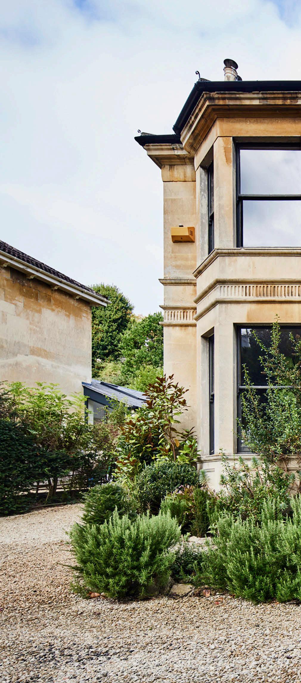 After all we’ve been through in the last couple years, and the pervasive uncertainty that continues to mar our days, all many of us want is a safe haven to call our own. The idyllic Sunnybank in Lyncombe ale offers just such a place. It’s all in the name really, ‘Sunnybank’, named for its southerly position immediately facing the Lyn brook. Despite its closeness to central Bath, there is a rural feel to yncombe ale, which offers views out across rolling elds where deer are often said to emerge from the hedgerows beyond for an early evening sweet grass snack. There’s comfort in the history of the house too – built in the 1800s, it’s withstood so much already, and will continue to withstand in the future. The neo-Palladian design of the honey-coloured limestone ashlar walls encase a multitude of beautifully restored features that reflect its long lifespan an ornate stone staircase, restored box sash windows, ionic pilasters supporting a leaded transom light and entablature with a split pediment above, characterful cast iron radiators and ornate decorative Victorian plasterwork and ceiling roses.