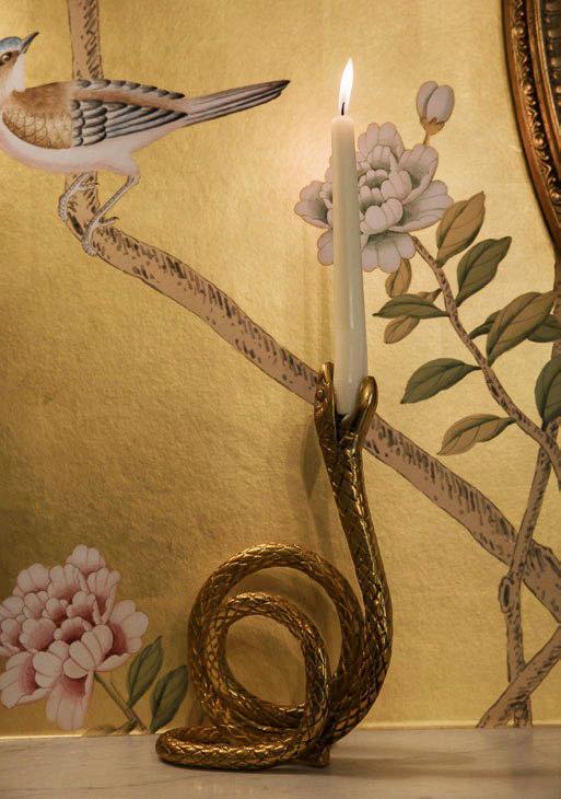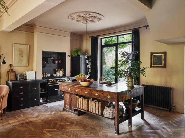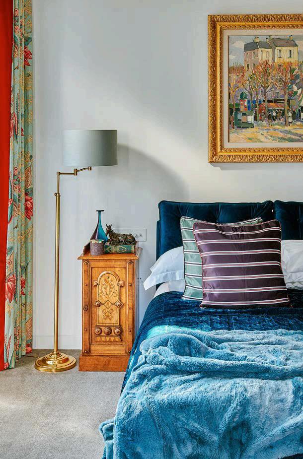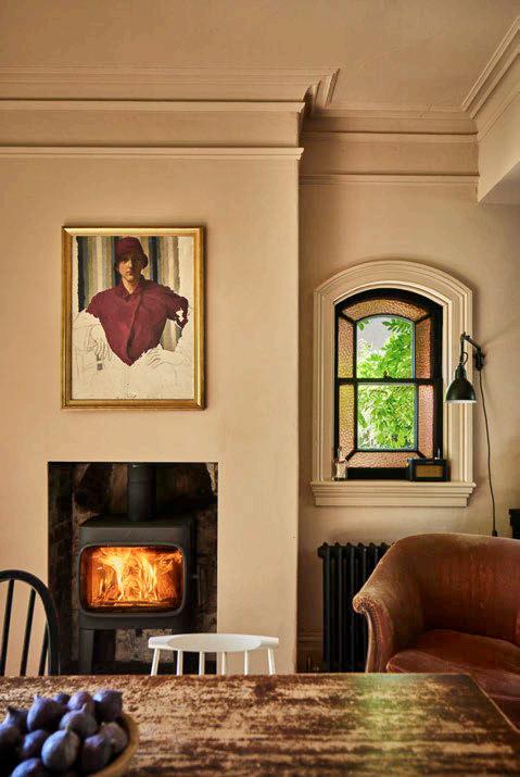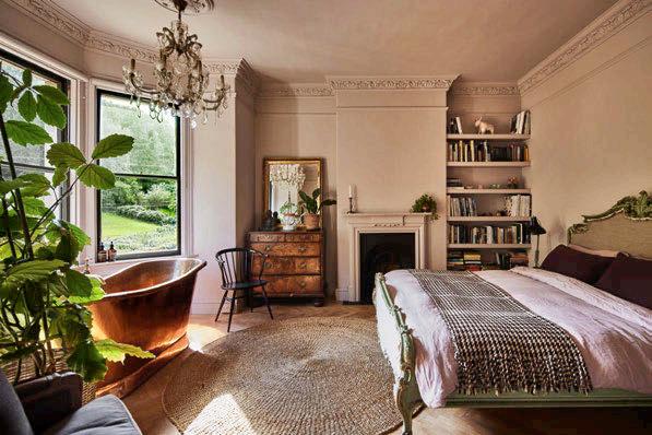 It’s a warming haven built for gatherings. The kitchen-dining room offers one of the spaces of particular note. he open-plan design lled with chunky dark woods and carefully mismatched furniture give an effortless feel to what any design a cionado can see is a meticulously curated space. The end result is an atmosphere you can soak up, one that whispers, ‘come, lounge, relax’. On entering, even the most reluctant cook will struggle not to be drawn to the kitchen, which makes inventive use of antique science laboratory workbenches to form part of the copper-clad worktops. he tures and ttings are seamless – a deep inset sink with stylish brass bibcock taps and vast Falcon range stove set snugly in the hearth nish the space with aplomb. And best of all, during the summer months, French doors fold back for access to the terrace.