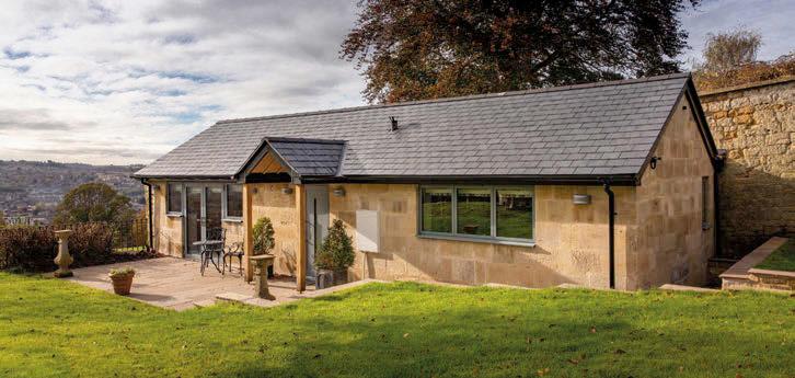 Outside, in addition to the thoughtfully landscaped gardens you ll nd the detached coach house. Constructed of the same limestone ashlar as the main, climbing roses cling to the walls, ascending to two pitched dormers on either side of the pantile roof. It’s an immaculately furnished outhouse, converted into a fashionable one-bedroom studio with quadripartite full-height folding glass doors that open into the main living area. his is clad in pale matt-varnished wood with a kitchen area along the rear wall, and a double-height seating area set within a dramatic roof pitch and e pansive elu windows, which make the room as bright and sunny as the property s title would imply. he me anine bedroom is set above the little haven – and how this space is used, well, that’s the owner’s choice.