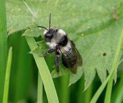 An ashy mining bee in distinctive black-and-grey