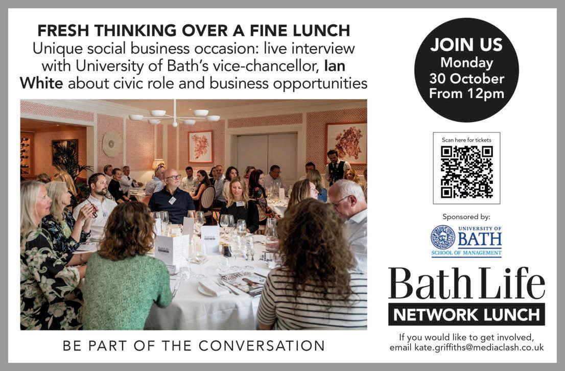 Chief executive Greg Ingham greg.ingham@mediaclash.co.uk Bath Life MediaClash, Carriage Court, 22 Circus Mews, Bath, BA1 2PW. tel: 01225 475800; www.mediaclash. co.uk Instagram @BathLifeMag ©All rights reserved. May not be reproduced without written permission of MediaClash.