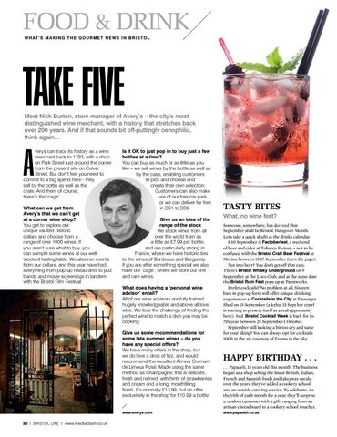 Is it OK to just pop in to buy just a few bottles at a time? You can buy as much or as little as you like – we sell wines by the bottle as well as by the case, enabling customers to pick and choose and create their own selection. Customers can also make use of our free car park, or we can deliver for free in BS1 to BS9. Give us an idea of the range of the stock We stock wines from all over the world from as a little as £7.99 per bottle, and are particularly strong in France, where we have historic ties to the wines of Bordeaux and Burgundy. If you are after something special we also have our ‘cage’, where we store our fine and rare wines. What does having a ‘personal wine advisor’ entail? All of our wine advisors are fully trained, hugely knowledgeable and above all love wine. We love the challenge of finding the perfect wine to match a dish you may be cooking. Give us some recommendations for some late summer wines – do you have any special offers? We have many offers in the shop, but we do love a drop of fizz, and would recommend the excellent Aimery Cremant de Limoux Rosé. Made using the same method as Champagne, this is delicate, fresh and refined, with hints of strawberries and cream and a long, mouthfilling finish. It’s normally £13.99, but on offer exclusively in the shop for £10.99 a bottle. www.averys.com