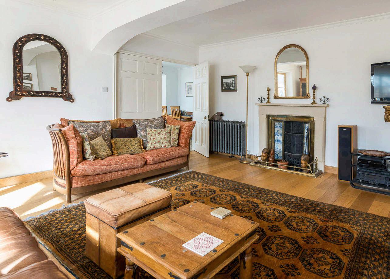 The drawing room brings all the traditional charms, with an oa floor and stone fireplace with delightful blue and white Dutch tiles. Big double doors open to the dining room, conservatory and garden room.