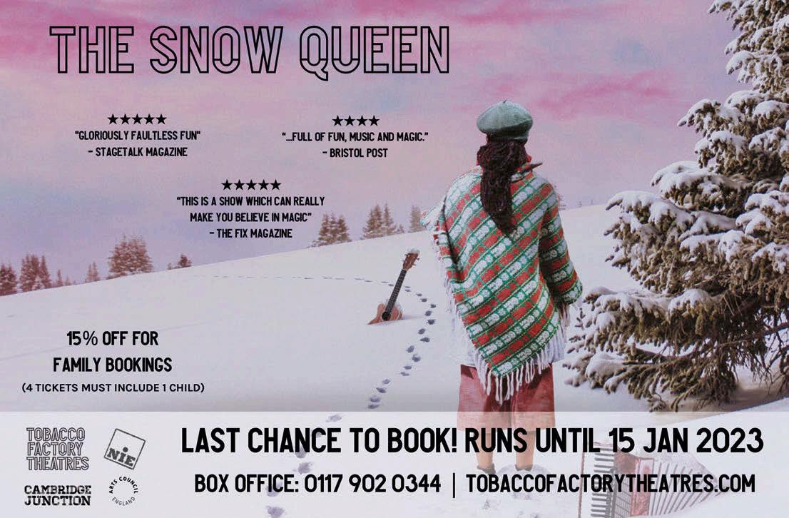THE SNOW QUEEN n the s festi e biggie this winter, erda once again heads to the frozen north to save best friend Kaj from the icy clutches of the Snow Queen; tobaccofactorytheatres.com
