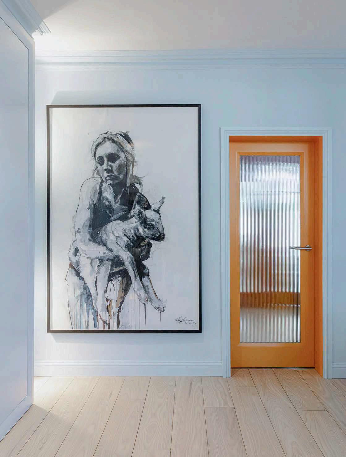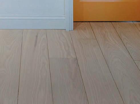 he oor is made from ash engineered planks treated with white smo oil, to help re ect light and make the space lighter. he planks run through the at, aligning with the doors in the kitchen and bedrooms to unify the rooms.