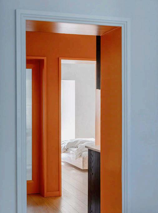 “The architrave, skirting and cornicing in the living room have classical mouldings; however the woodwork in the kitchen and bedrooms are Scandi-minimalist with no mouldings at all. We painted the kitchen in Dutch orange to make the space feel vibrant and warm, to distract from the fact that it doesn’t have windows. We installed doors with reeded double-glazed glass to all rooms, except the bathroom, to pull light into the kitchen from the living room and bedrooms. Doubleglazing is normally used on exterior windows, but it gives amazing sound insulation here. erfect for a small at he bedrooms have built in cabinetry as their defining feature and are the most zen and classically anish hygge’. find that very Scandi’ design can be too subtle and pared-back, but in this case the calm natural tones help to balance the bolder colours of the kitchen and the Victorian features of the living room.