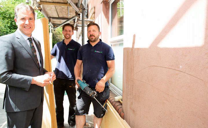 Metro Mayor Dan Norris talking to two of the experienced Urbane Eco team, Tom and Kyle, who were retrofitting four homes on Philip Street in Bristol