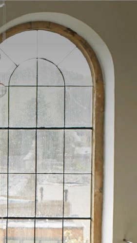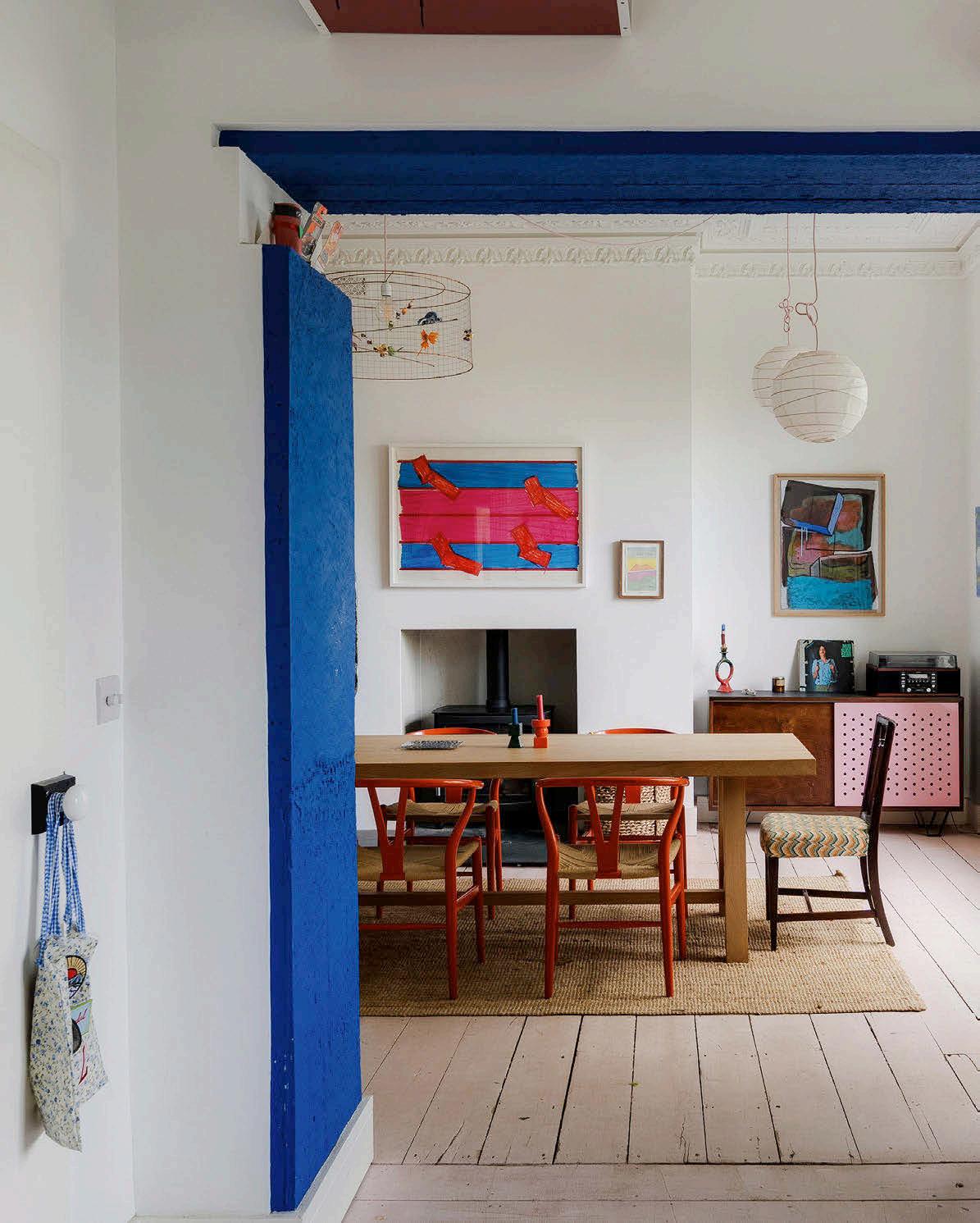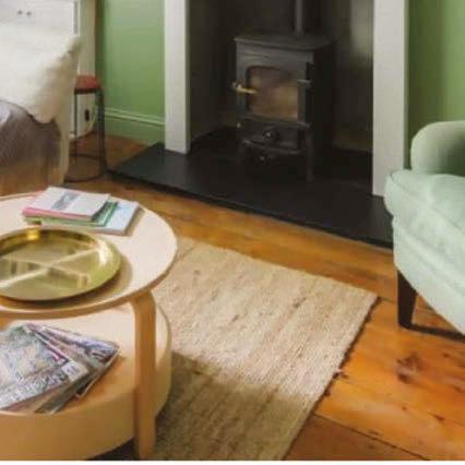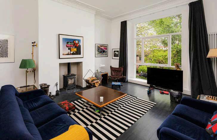 tripped wooden oors run throughout much of the house, owing from the hall into the open-plan kitchen, where oversized windows look out over the garden, then via a square arch into the family and dining rooms. Despite the contemporary aesthetic, due reverence has been paid to the original ceiling plasterwork, while a wood-burning stove in a simple alcove straddles the modern and traditional.