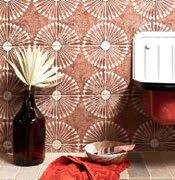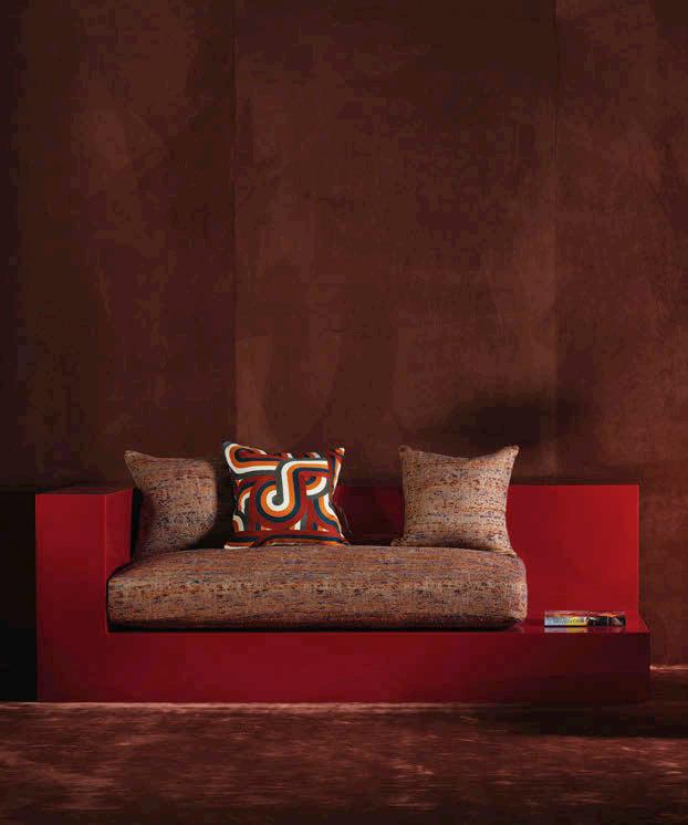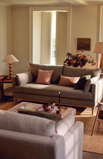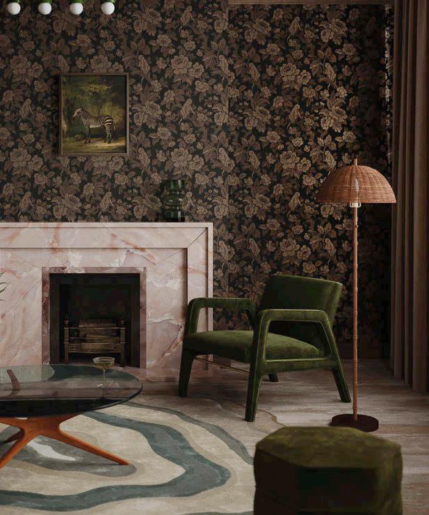 range of brown papers range from delicate botanicals to modern geometrics; BELOW: Romo effortlessly ticking off the brown, ’70s-retro and squishy sofas trends all in one