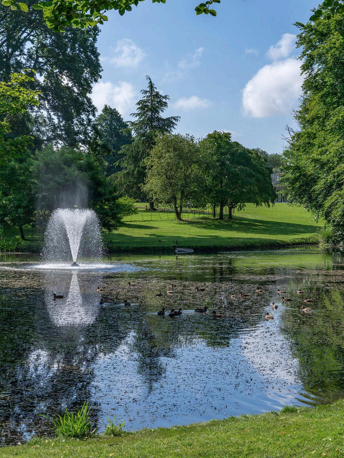 A rock garden, paved gardens and a lily pond with a pavilion are all carefully arranged and positioned around the house; a hard tennis court lies between the stable yard and village lane, and extensive woodland provides plenty