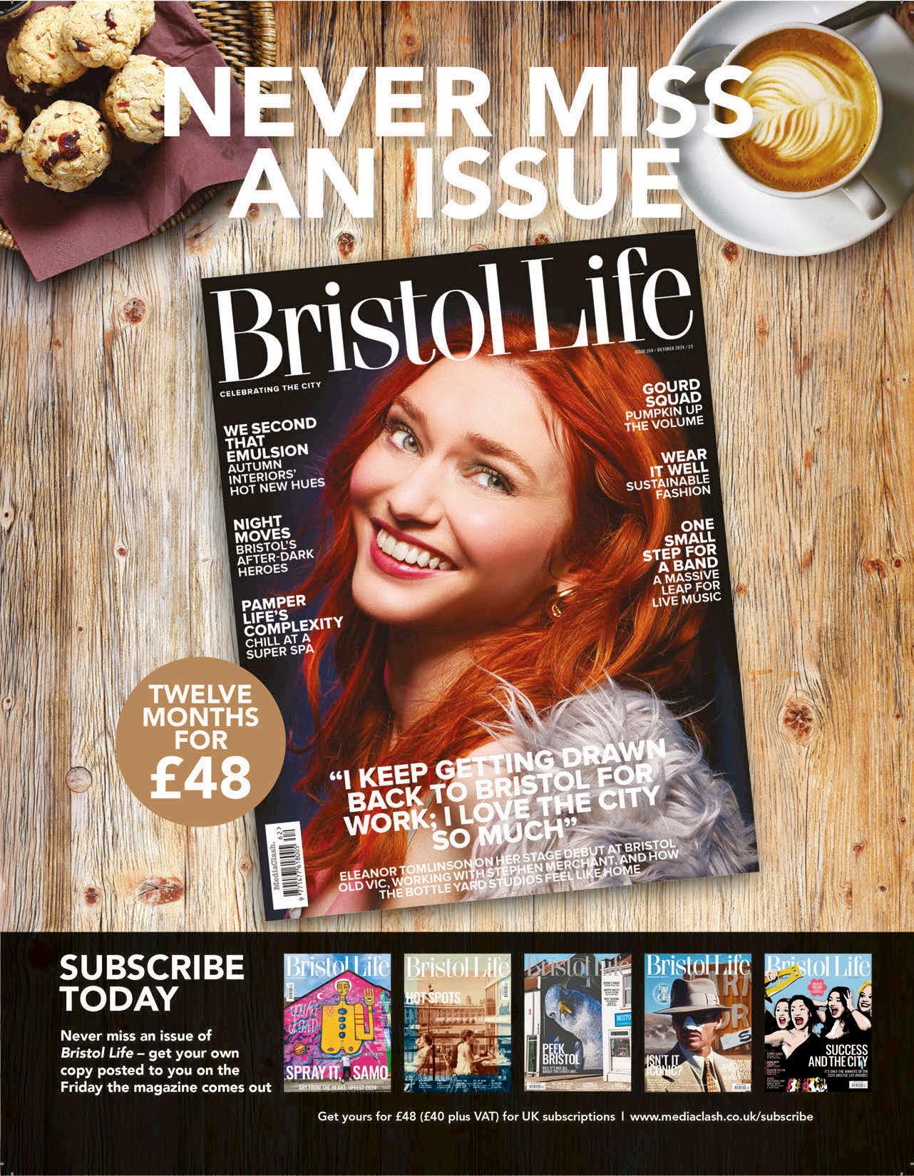 To prevent further triggering, this time I shall stick to the facts. I shall refrain from commenting on the absolute radiance to my left, and focus instead on why Eleanor is once again among us. I say ‘once again’, because at this point Bristol can practically claim her as one of its own; she’s filmed three major TV series here, and is about to make her stage debut in Matthew Lopez’s Reverberation at Bristol Old Vic. She kindly broke off from rehearsals to chat about the play and say lovely things about this city; she’s a total sweetheart –am I allowed to say that? Probably not – and you can read the interview on page 44.