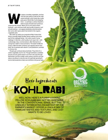 KOhLRaBI WELL NOW, HERE’S A FUNNY LOOKING FELLOW. KOHLRABI MAY NOT BE HANDSOME IN THE CONVENTIONAL SENSE, BUT THIS UNIQUELY INTIMIDATING INHABITANT OF THE FARMER'S MARKET OFFERS A UNIQUE MIX OF FAMILIAR TASTES AND TEXTURES, AND JUST WANTS TO BE LOVED