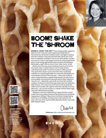 MORELS, WHAT THE HEY? These intriguing little organisms defy the main mushroom season (generally September to November) by raising their knobbly heads in springtime, feeding from the nutrients in soil and wood that other plants shun. Find them in wasteland, woodland, even in your back garden, but take care if you’re a have-a-go forager, because for every funghi friend there’s a foe lurking right behind it (you’ve heard of Christopher McCandless, right?). We’ve more on toxic ‘false morels’ on p8. Morels aren’t the only season-flouting ’shrooms we’ve found this month, either. In Exeter there’s a trio of urban farmers cultivating exotic oyster mushrooms purely in coffee grounds. They grow them all year round, and reckon their sustainable methods are a darned sight better for us (and the planet) than our conventional mushroom farming ways – read more on p18. As well as celebrating these capped fungal growths for their flavour and versatility, we should be looking forward to them helping us stay slim, too – apparently. Last month we heard US scientists created a mushroom extract that stops taste buds from detecting bitter flavours. This means we won’t have to load up treats like coffee and chocolate with sugar to mask their naturally occurring bitterness – we can pop mushers in, instead. Fat-free Easter eggs next year? We’ll keep you posted. Elsewhere, have you noticed Devon’s gone into full-on party mode? Not only is Exeter Festival of South West Food and Drink happening on 29 April-1 May, there’s the River Cottage Spring Food Fair on 27-29 May and Salcombe Crab Festival on 30 April, with man of the moment (AKA Saturday Kitchen new host) Matt Tebbutt. Enjoy!