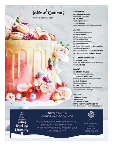 MAINS 69 STREET TALKIN’ The rise of street food culture 77 FESTIVAL FEASTING Gearing up for Abergavenny Food Fest 83 THE C-WORD Christmas parties are go 97 GRILLED We chat to internationally celebrated chef and writer Yotam Ottolenghi