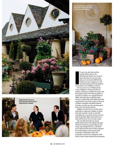 t’s not every day that you have a police officer ask you for identification before you can go to lunch. But then it’s not every day that you’re invited to HRH Prince Charles’ private residence for a bit of munch and a stroll in the gardens (well, unless you’re William or Harry). For its recent series of Talking Food events, Highgrove welcomed a host of culinary superstars to debate hot topics and host supper clubs in the famous gardens. I was there to fanboy over Angela Hartnett MBE, who had come to talk about this country’s relationship with Italian food. She was joined by more food royalty in the form of Polpo co-founder and author Russell Norman, as well as an extra surprise guest, food critic Tom Parker Bowles. Highgrove knows how to set the scene, and today an impressive display of winter fruit and veg decks out the events hall, reminding me very much of a harvest time school assembly (albeit with much more class and far fewer tins of tomato soup). The trio talk about their personal Italian food journeys through the decades. Hartnett’s creativity, grasp of flavour and innate talent helped win her a Michelin star in 2014 and have been well-recognised by Gordon Ramsey (she trained at his restaurants, Aubergine, Petrus and Amaryllis). Cucina is her collection of 140 hearty, rustic recipes inspired by growing up