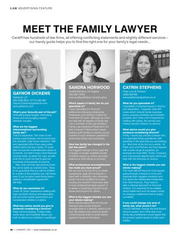 Gaynor Dickens Geldards LLP 029 2038 6524; 07714 093 465 Gaynor.Dickens@geldards.com; www.geldards.com What’s your favourite part of the job? Unknotting legal tangles, minimising stress and encouraging respect between couples. What are the biggest misconceptions surrounding family law? That it’s expensive. The costs of not having a good lawyer can be enormous. For example, Dale Vince married in 1981 and separated after three years when neither party had any money. 27 years later he was the multimillionaire owner of Ecotricity but didn’t have a final financial remedy order, so when his ‘very’ ex-wife took him to court he had to give her hundreds of thousands of pounds. Also, that common law partners have the same rights as married ones. There is no guarantee that you will be entitled to a share of the property you call home, even if you’ve spent years living there – getting a cohabitation agreement will help. What do you specialise in? I have 30 years’ experience dealing with high net worth divorce and separation, pre and post-nuptial agreements and complicated children’s matters. What key advice would you give to someone considering a divorce? Keep communicating. It helps keep costs down and hopefully allows you both to attend your children’s weddings!