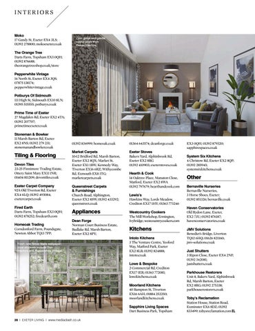 Other Bernaville Nurseries Bernaville Nurseries, 3 Horse Shoes, Exeter; 01392 851326; bernaville.co.uk Haven Conservatories Old Rydon Lane, Exeter, EX2 7JU; 01392 876187; havenconservatories.co.uk JMV Solutions Benedict’s Bridge, Liverton TQ12 6HQ; 01626 821160; jmv-solutions.co.uk Just Shutters 3 Ripon Close, Exeter EX4 2NF; 01392 342081; justshutters.co.uk Parkhouse Restorers Unit 8, Bakers Yard, Alphinbrook Rd, Marsh Barton, Exeter EX2 8RG; 01392 275338; parkhouserestorers.co.uk Toby’s Reclamation Station House, Station Road, Exminster EX6 8DZ; 01392 833499; tobysreclamation.com
