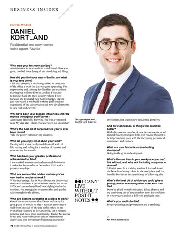 What has been your greatest professional achievement to date? I was ranked number one in the central division in London for house sales in December 2015, with a previous employer. What are some of the oddest matters you’ve ever had to resolve at work? While marketing a flat in Marylebone, we discovered that there had been a petrol station on the site in the 1970s, so ‘contaminated land’ was highlighted in the searches. We managed to overcome this and get the sale through for the clients. What are Exeter’s strengths as a place to work? One of the main reasons that Exeter makes such a great place to work is its size – you can pretty much walk from one side of the city to the other. It has everything you need to live and work, yet it remains personal and has a great community. Exeter has access to rail and road connections and an international airport and it is increasingly becoming a target for 78 I EXETER LIVING I www.mediaclash.co.uk