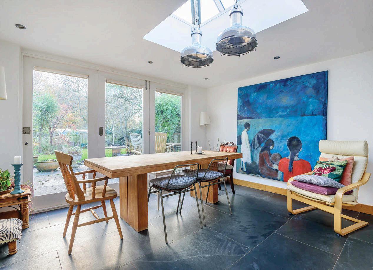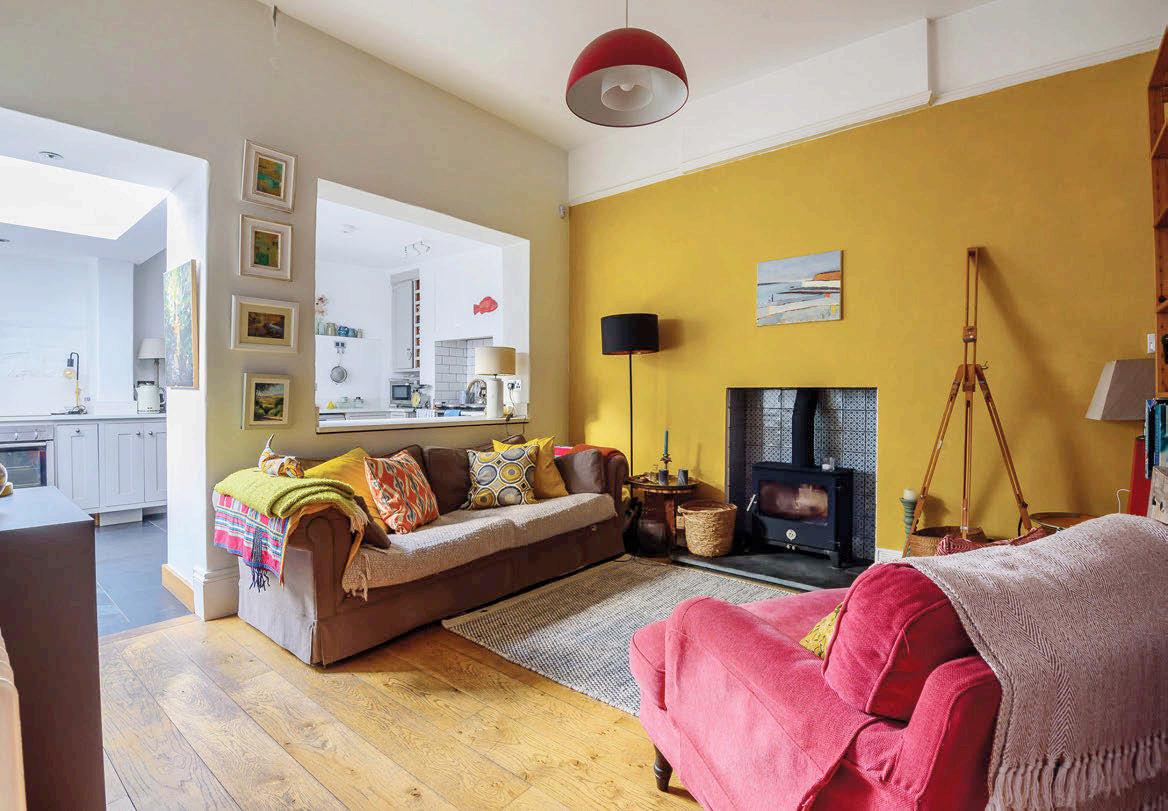 he ground oor is made u of the sitting room, dining room, kitchen, utility room with the added benefit of an extra sitting room come family room, (that’s the sunset-coloured room, pictured right) that opens onto the kitchen and has a cosy wood burner.
