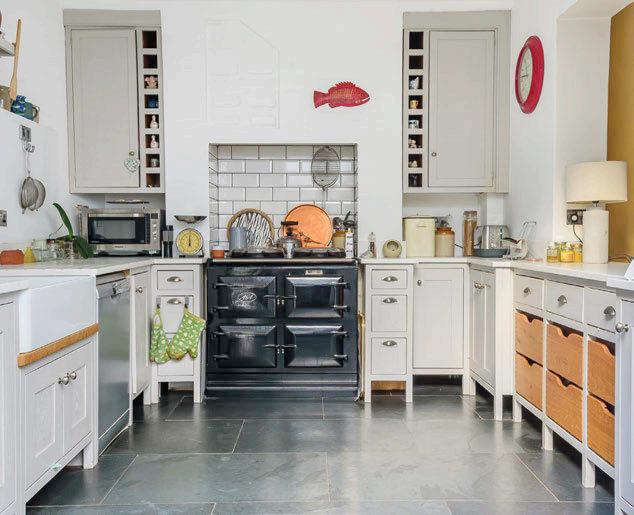 Features of the open-plan kitchen and dining area include roof lanterns, slate oors, glorious under oor heating, lus bi fold doors leading out onto the garden. The set up here also includes a range of shaker-style units with a double butler sink, electric oven and induction hob as well as an Aga. Washing machine, and sink units with plenty of storage are all neatly located in the utility room next door. stairs, the main bedroom has fitted wardrobes