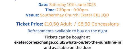 “I hope you can join us at this charity concert, where my singing groups will take you on a musical journey to Let the Sunshine In, all in aid of raising funds for Devon’s excellent cancer support charity, Force.” www.exetercornexchange.co.uk