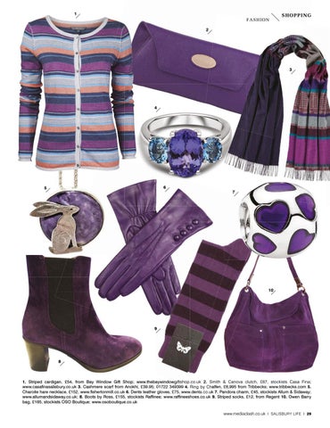 1. Striped triped cardigan, £54, from Bay Window Gift Shop; www.thebaywindowgiftshop.co.uk 2. Smith & Canova clutch, £67, stockists Casa Fina; www.casafinasalisbury.co.uk 3. Cashmere scarf from Anokhi, £39.95; 01722 349399 4. Ring by Chalfen, £6,995 from Tribbecks; www.tribbecks.com 5. Charoite hare necklace, £152, www.fishertonmill.co.uk 6. Dents leather gloves, £75, www.dents.co.uk .dents.co.uk 7. Pandora charm, £45, stockists Allum & Sidaway; www.allumandsidaway.co.uk; 8. Boots by Ross, £155, stockists Raffinee; www.raffineeshoes.co.uk 9. Striped socks, £12, from Regent 10. Owen Barry bag, £165, stockists OSO Boutique; www.osoboutique.co.uk www.mediaclash.co.uk I SALISBURY LIFE I 29