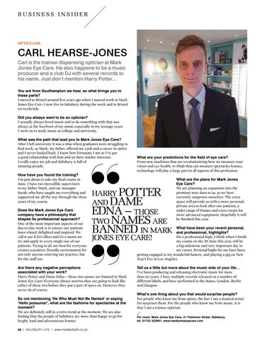 Are there any negative perceptions associated with your work? Harry Potter and Dame Edna – those two names are banned in Mark Jones Eye Care! Everyone always worries they are going to look like either of these two before they put a pair of specs on. However they never do of course. So not mentioning ‘He Who Must Not Be Named’ or saying ‘Hello possums!’, what are the fashions for spectacles at the moment? We are definitely still in a retro trend at the moment. We are also finding that the people of Salisbury are more than happy to go for bright, loud and adventurous frames. 52 I SALISBURY LIFE I www.mediaclash.co.uk